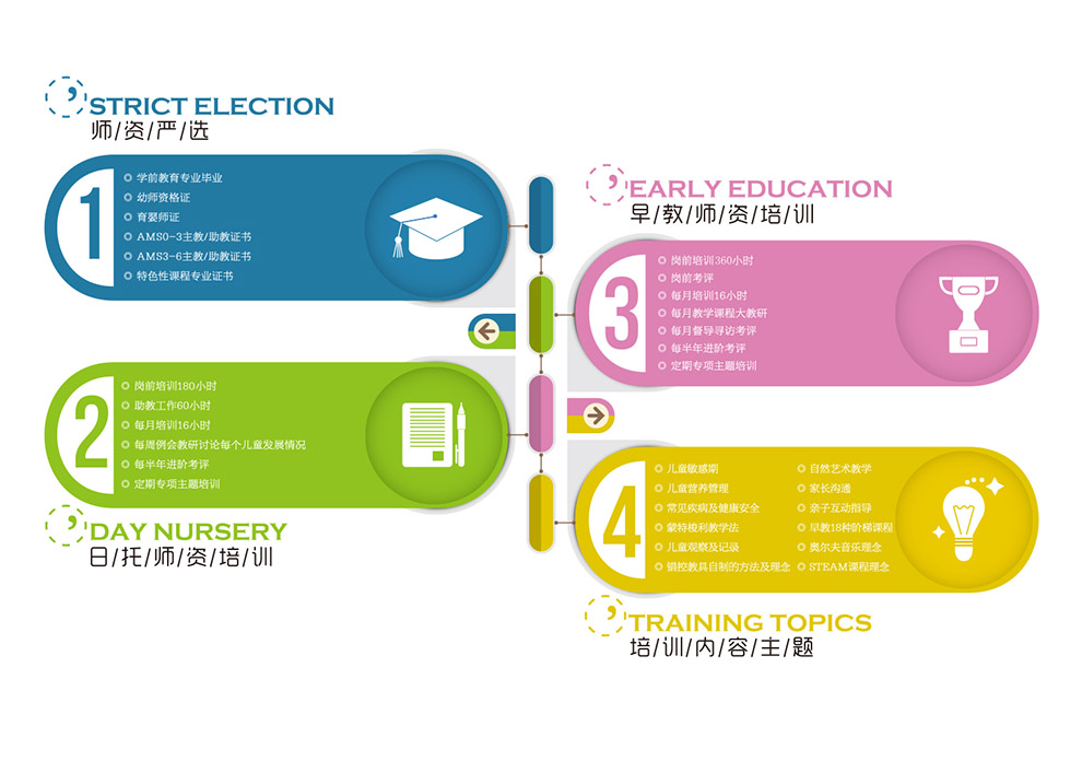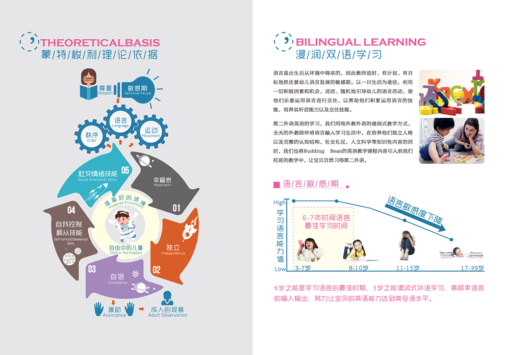 嬰智貝佳的課程體系分為嬰兒?jiǎn)⒚伞⒏薪y(tǒng)、多元智能、奧爾夫音樂、蒙氏感官、右腦思維等幾大特色板塊。課程覆蓋0-3歲學(xué)前兒童,3-6歲幼兒等多個(gè)學(xué)齡階段。同時(shí)我們的課程體系充分將科學(xué)教育與素質(zhì)教育相結(jié)合;將短期培訓(xùn)與長(zhǎng)期教育相結(jié)合,用長(zhǎng)遠(yuǎn)的目光去發(fā)展我們的教育事業(yè)。另外我們擁有強(qiáng)大的專家團(tuán)體,為我們的課程體系在國(guó)內(nèi)的推廣奠定了堅(jiān)實(shí)的理論基礎(chǔ)。我們對(duì)所有課程體系設(shè)置了專業(yè)的測(cè)評(píng)方案,針對(duì)測(cè)評(píng)情況提供個(gè)性化的訓(xùn)練方案,真正實(shí)現(xiàn):“因材施教。”