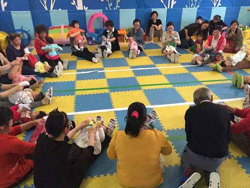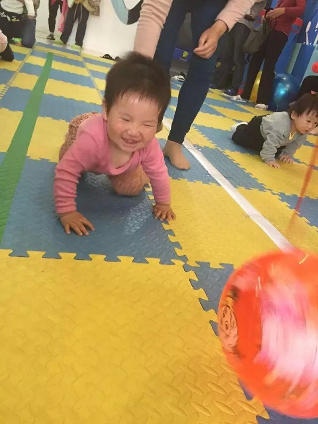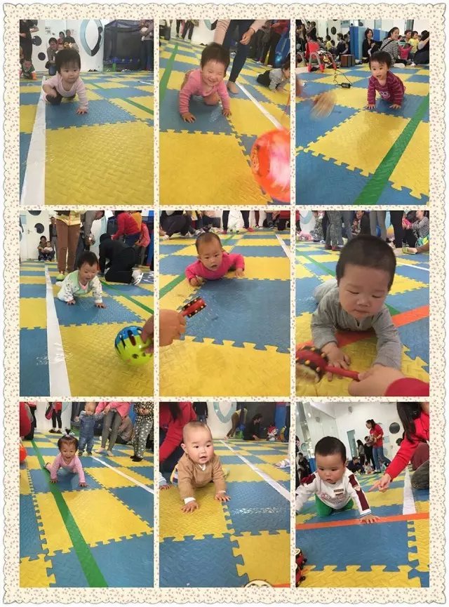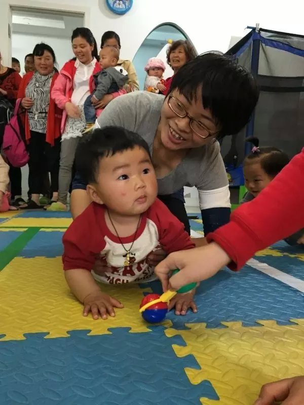 加油加油爬呀,家長(zhǎng)和老師都在逗寶寶往前爬行