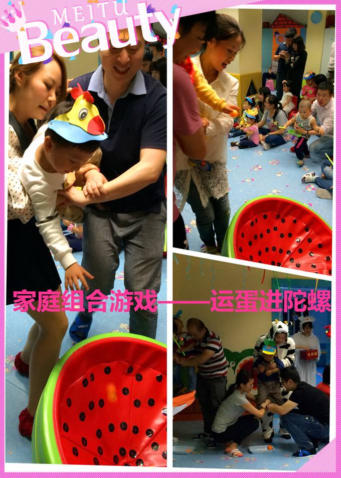 森林里小動(dòng)物的表演真是惟妙惟肖,下面要考驗(yàn)各組家庭的默契度了,運(yùn)蛋游戲規(guī)則如下:兩位家長(zhǎng)用手做成嬌子抬著小寶寶到對(duì)面,小寶寶將手里的小球準(zhǔn)確扔進(jìn)大陀螺中,扔的球數(shù)量越多的家庭獲勝。預(yù)備,比賽開(kāi)始!