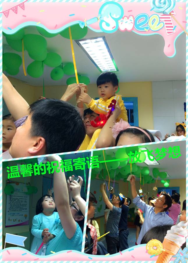 開(kāi)場(chǎng)前,每個(gè)家長(zhǎng)都會(huì)發(fā)放一張賀卡,上面寫(xiě)上各自的心愿祝福,寶寶和爸爸媽媽合力將寫(xiě)有祝福語(yǔ)及心愿的小卡片掛到連接氣球的彩帶上,預(yù)示著讓夢(mèng)想放飛,意義深遠(yuǎn)啊。