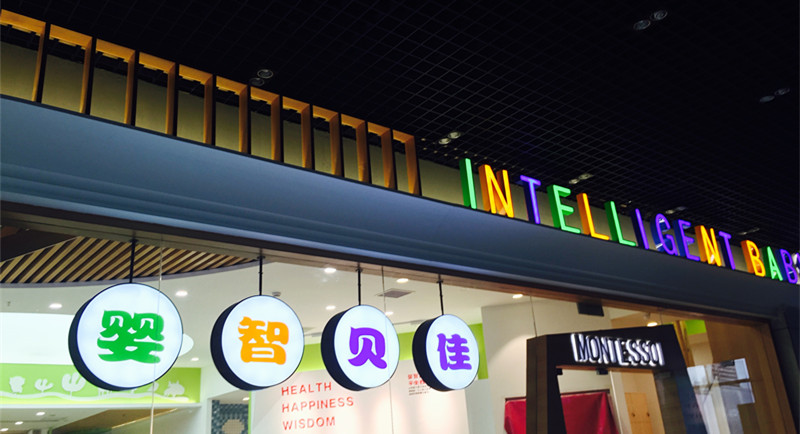 沿著蘇寧易購邊上的自動扶梯登上二樓左拐,映入眼簾的就是裝修清新亮麗、大氣和可愛與一體的“嬰智貝佳MONTESSOI”