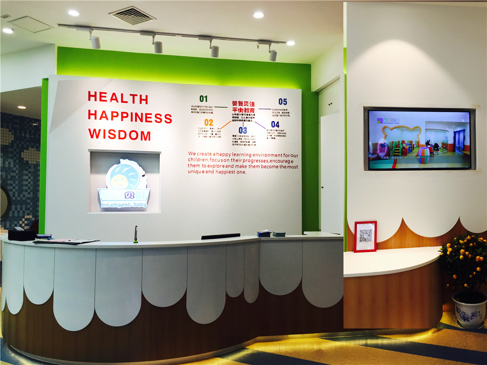 前臺是文化背景墻,走進(jìn)來便能看到嬰智貝佳歷史的沉淀和展現(xiàn)。墻上面有三個英文字,分別代表的意思是:Healthy(健康)、happiness(幸福)、wisdom(智慧),這三個代表的是我們企業(yè)文化,和教學(xué)模式。Ta像一本書一樣,代表我們的企業(yè)歷史時間的悠長,家長在整個教學(xué)課程領(lǐng)域當(dāng)中,能看到十幾年基石的一個過程,對寶寶大腦發(fā)育的一個幫助。