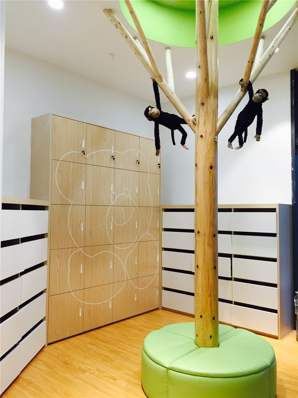 進(jìn)門右側(cè)是小熊換鞋和箱包處,柜子是由香港設(shè)計師設(shè)計的,比較人性化,合理,空間也比較美觀。一個家庭一個鞋柜,沒有把柄,這樣寶寶過去也不會撞到,媽媽再也不用到處找寶寶的鞋子啦。柜子里,家長們可以放一些尿布、衣服之類。用色也是很自然的色調(diào)。