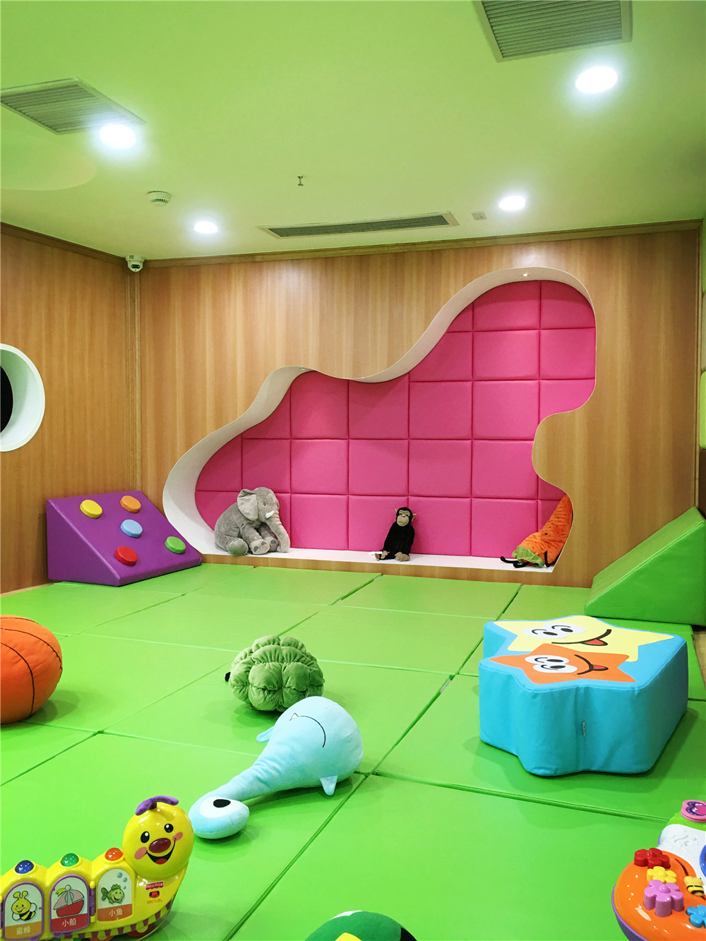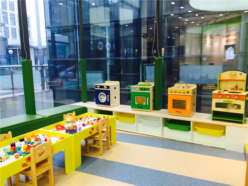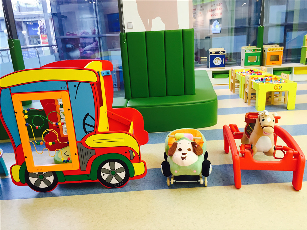 前臺大廳進(jìn)口玩具已擺設(shè)到位,寶貝們有???。