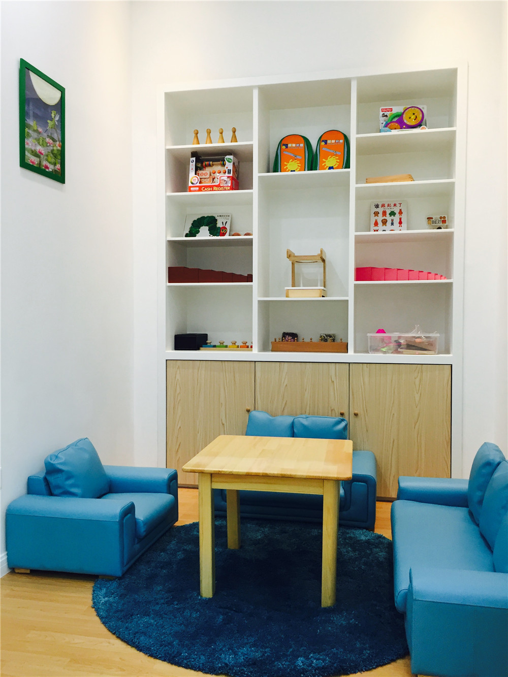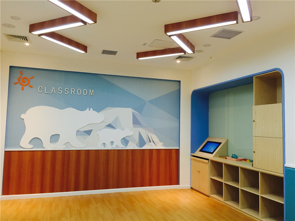 教室1采用北極藍(lán)色系列,清新的淺藍(lán)色系給家長和寶寶以平靜安逸的感覺,憨態(tài)可掬的熊媽媽和熊寶寶讓我們感受到了媽媽對寶寶的愛撫。