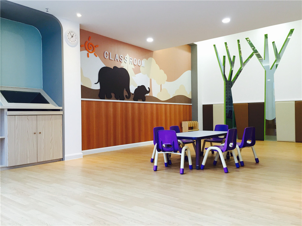 教室 2 徜徉在森林的象媽媽和象寶寶親子組合主題,主色調(diào)為咖啡色,比較耐看,視覺效果比較經(jīng)典、持久。軟包的顏色相間搭配也很合理,米色、深咖、淺咖、顯得相對沉穩(wěn)些。而且光線比較好。