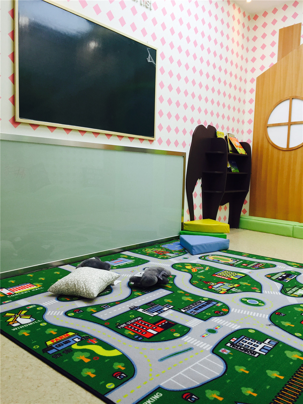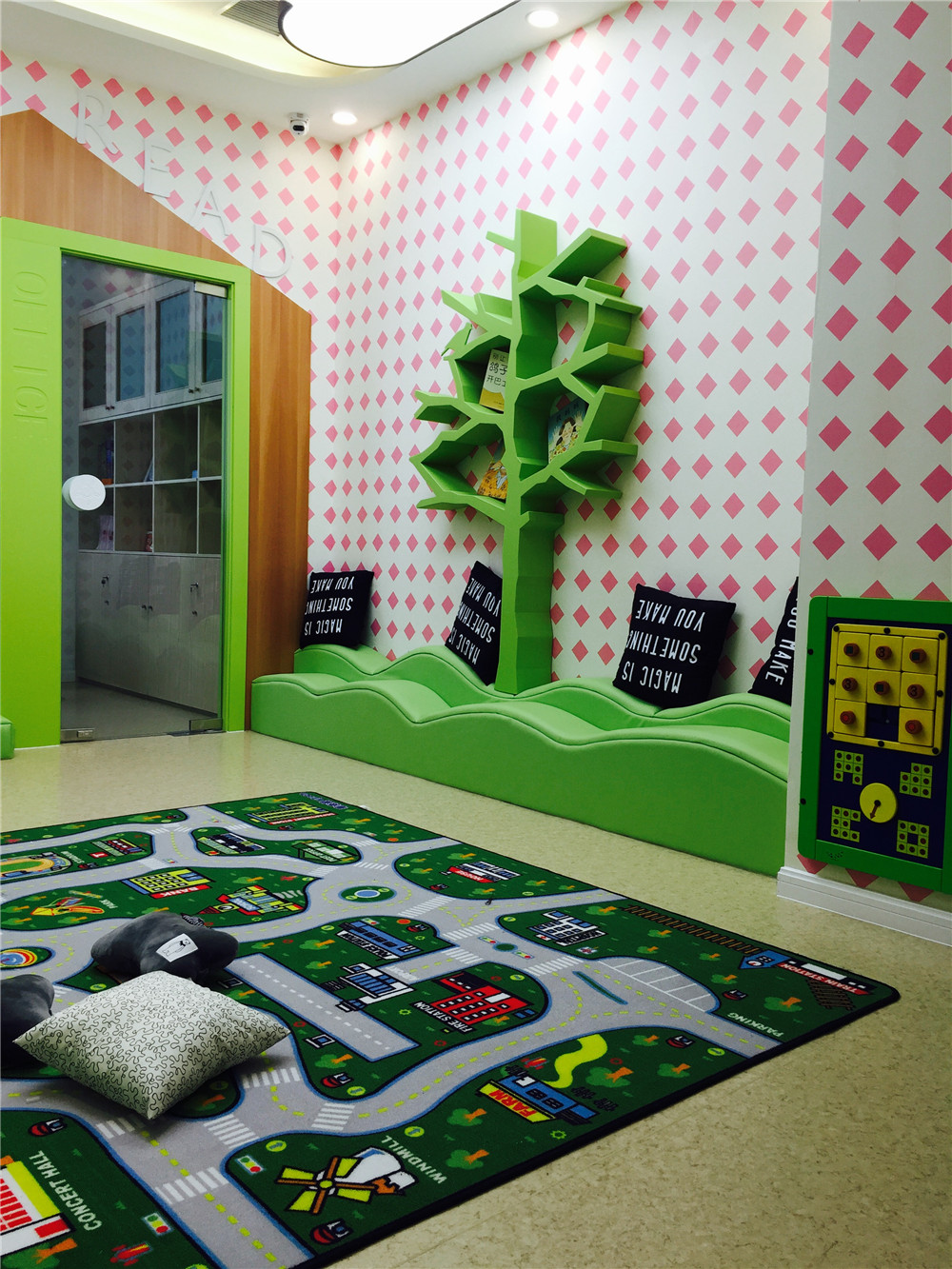 教室3和教室4之間是 閱覽室 墻上運用樹的形狀設(shè)計了一個書架,另一面墻是一只大象形狀的書架,再配合云朵的頂燈及嫩綠色的曲線型長椅,感覺身處森林小木屋的趣味,讓寶寶自在讀書;左邊墻壁又設(shè)計成涂鴉墻,讓寶寶可以自由發(fā)揮涂鴉。