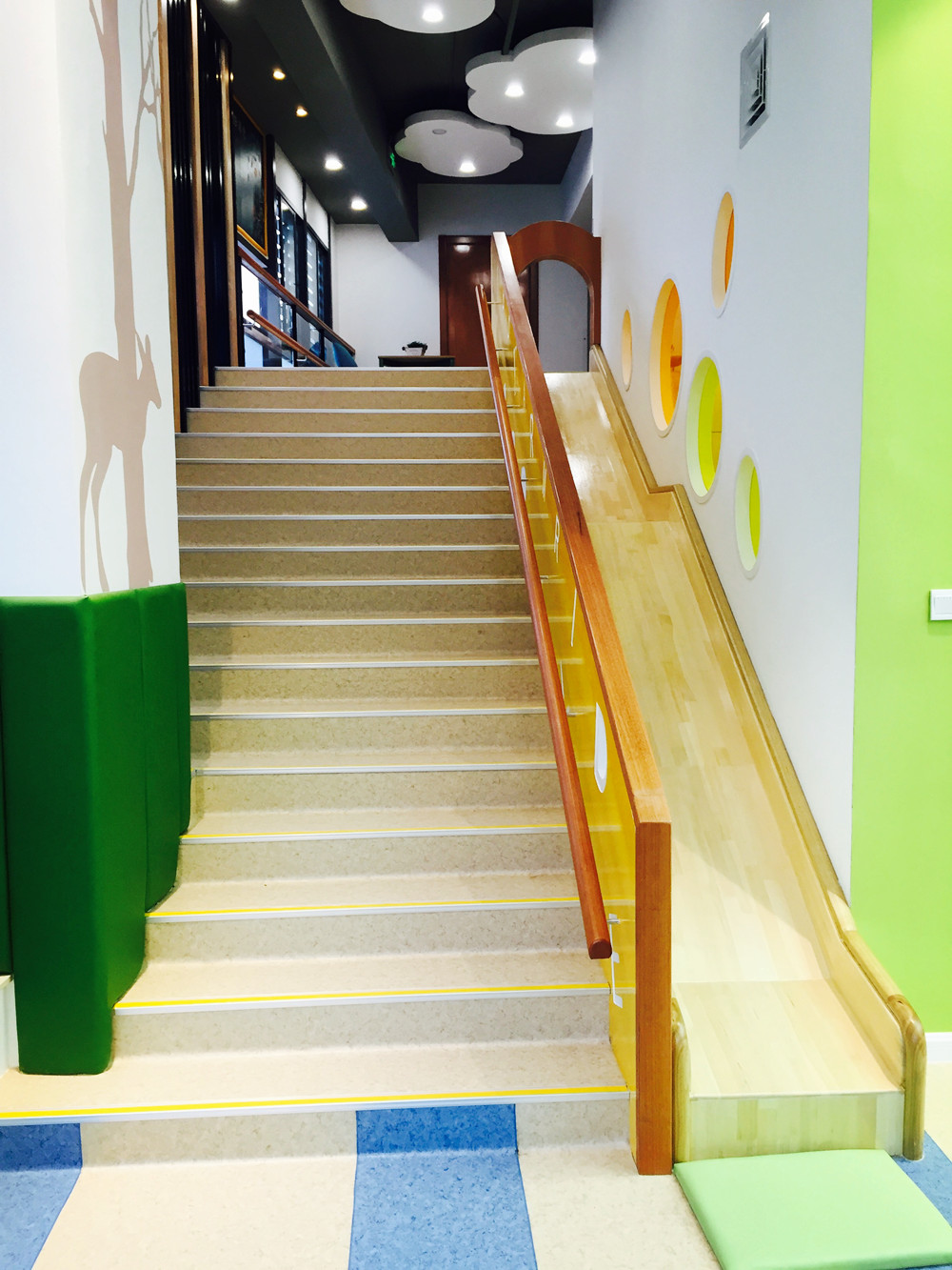 從一樓通向二樓的是小鹿徜徉的林間樓梯,還有讓人心癢的實木滑滑梯