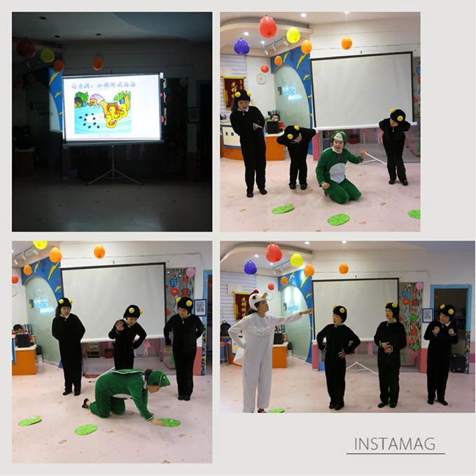 雖然爸爸腳上很疼但是義無反顧的向我們的媽媽飛奔而去,爸爸真的很棒哦!活動進行到這里氣氛已經(jīng)達到了一個高潮,下面是由我們老師們帶來的小蝌蚪找媽媽,老師們表演實在是太精彩了,活潑生動的語言和動作讓爸媽媽們看的目不轉(zhuǎn)睛哈哈大笑。
