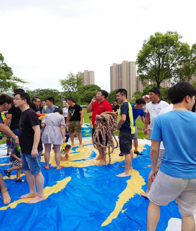哨聲剛響,我們爸爸們就使出渾身解數(shù),卯足了勁要把繩子拉過來,想來怎么會(huì)這么容易呢?哈哈,我們胖胖老師拿著水管沖過來啦!