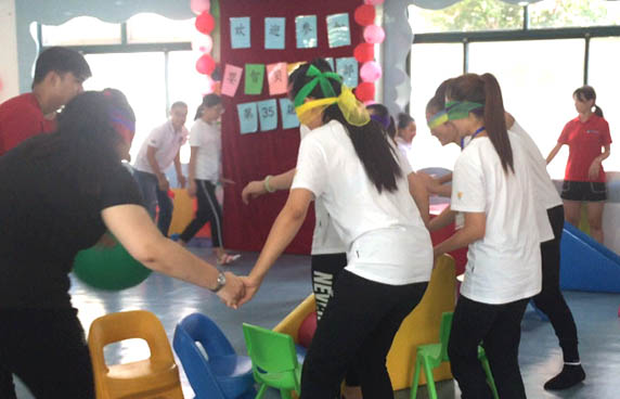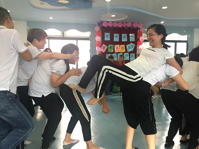 所有隊(duì)員老師排成一排,第一位老師看到答案之后,通過(guò)自己的肢體向第二位老師進(jìn)行表演,當(dāng)然在表演的過(guò)程中,其他老師都是背向他們。以此類(lèi)推,站在最后的一位老師要說(shuō)出答案。哈哈,明明是謎底是小Baby,最后有可能會(huì)被說(shuō)成是可愛(ài)的小豬,因?yàn)槌顺跃褪撬?,哈哈這腦回路也沒(méi)誰(shuí)了!太多好玩兒的細(xì)節(jié)小編也就不一一分享啦,下次有機(jī)會(huì)可以一起來(lái)參加哦!