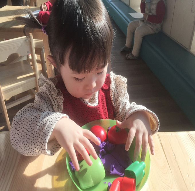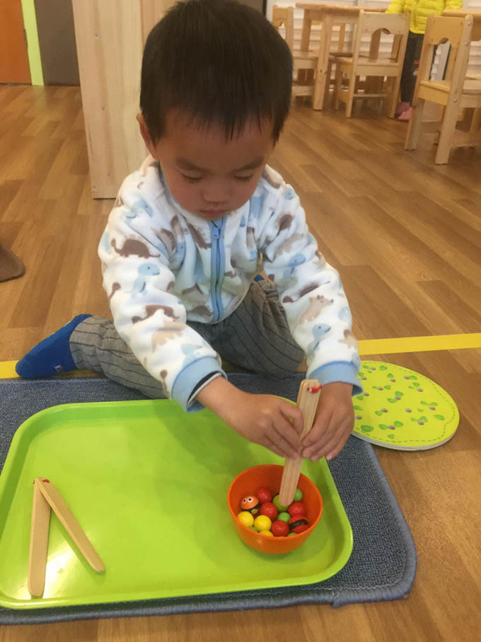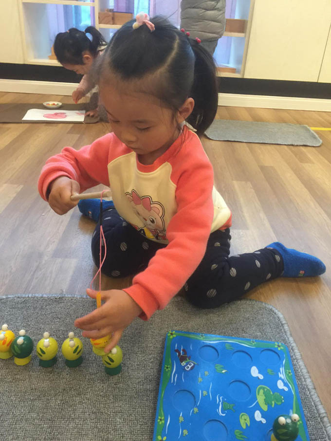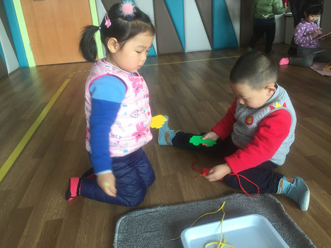 這個(gè)寶貝在整個(gè)班級(jí)里育齡段是最小。印象非常深的一個(gè)場(chǎng)景就是寶貝不會(huì)玩兒扣扣子的教具,找小哥哥幫忙,結(jié)果小哥哥也不是很會(huì)有些焦急,被旁邊的小姐姐看到了,小姐姐伸手過(guò)來(lái)幫忙,最后就是一個(gè)教具大家一起順利完成。就是這樣的一個(gè)小小的細(xì)節(jié),我相信一定會(huì)讓寶貝在最初建立社會(huì)關(guān)系時(shí)有著積極的影響。