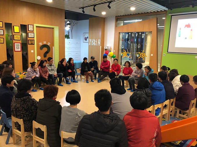 家長(zhǎng)們圍成一圈兒和老師們一起探討,分享育兒?jiǎn)栴}