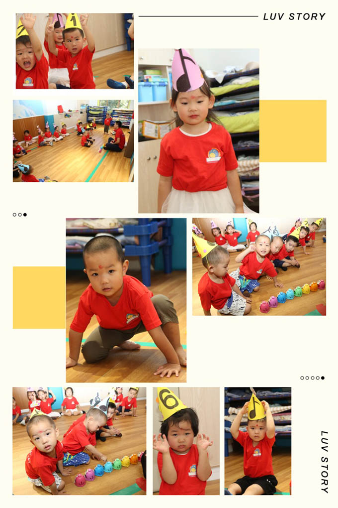 現(xiàn)在請把時間留給我們“貝貝班”小朋友吧,他們將變成可愛的音符寶寶為我們帶來“身體音階歌”的表演,看看我們像不像一個個跳動的音符呀~!