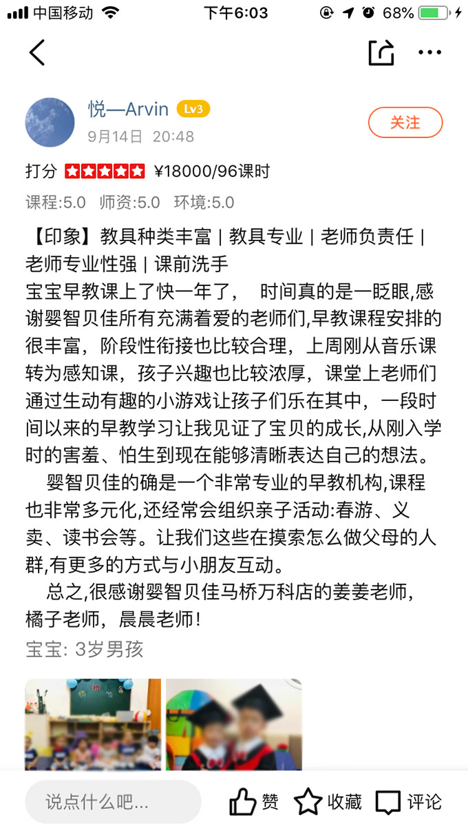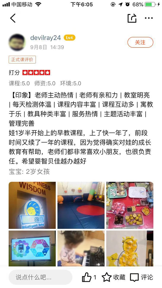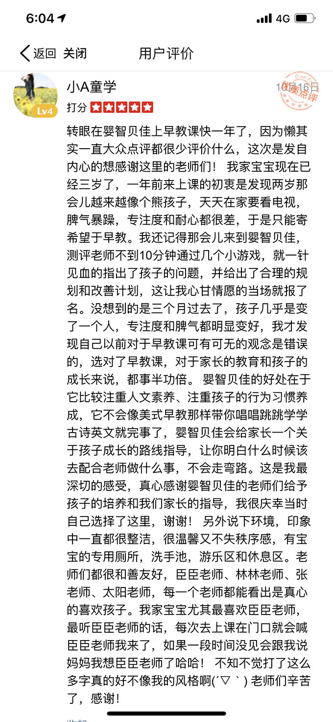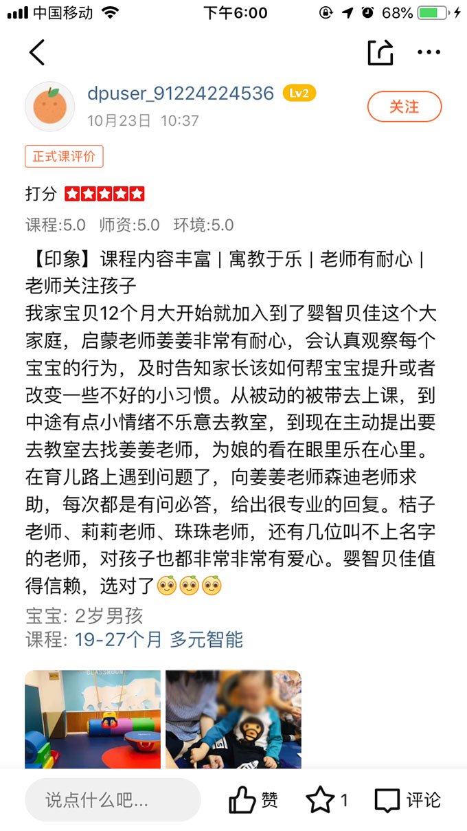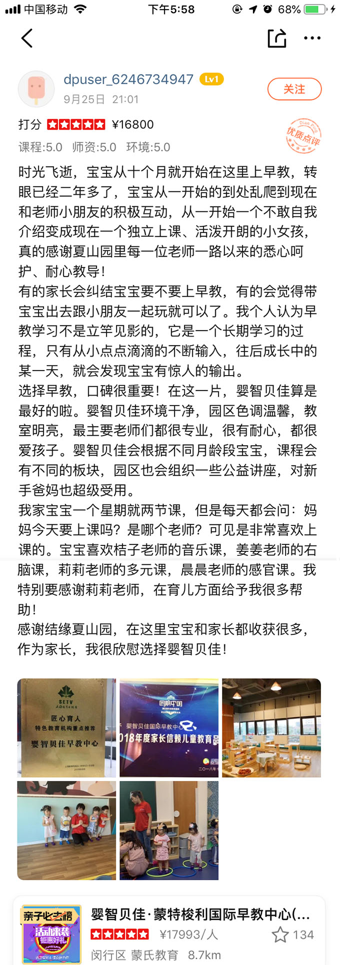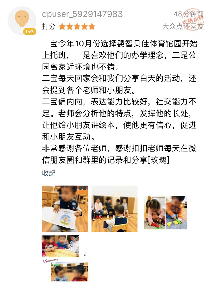 嬰智貝佳自創(chuàng)立以來(lái),因快樂高質(zhì)量的課程服務(wù)和良好的師資培養(yǎng)機(jī)制,得到眾多寶寶家長(zhǎng)的認(rèn)可,享有良好的社會(huì)口碑,這次能夠榮登大眾點(diǎn)評(píng)網(wǎng)2019親子必去榜,也是實(shí)至名歸。