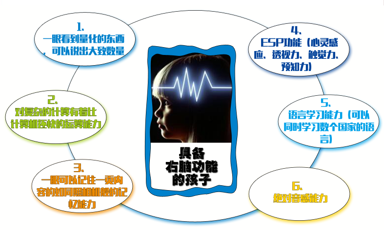 右腦是潛在的沒有被開發(fā)應用的能力,每個人就像一顆種子,都具 有無限的潛能,每個人的大腦都具有無限發(fā)展的可能性。孩子在出生的時候,它的大腦就已經(jīng)基本發(fā)育完成。如果在這個時候能給孩子在肢體活動、感官接觸、語言互動交流上獲得各種刺激,可以促進“大腦樹狀軸突”的發(fā)展,強化嬰幼兒大腦及心智的智能,并發(fā)展為具有能不斷思考、系統(tǒng)化建構(gòu)知識網(wǎng)絡(luò)的大腦。