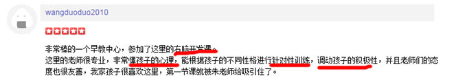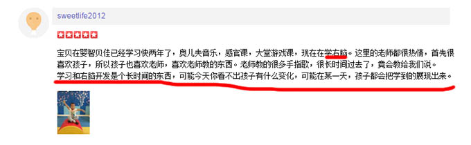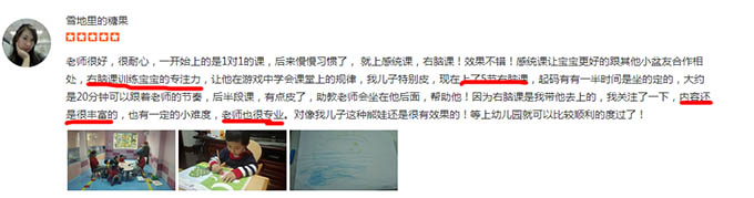 老師很好,很耐心,一開始上的是1對1的課,后來慢慢習慣了, 就上感統(tǒng)課,右腦課!效果不錯!感統(tǒng)課讓寶寶更好的跟其他小盆友合作相處,右腦課訓練寶寶的專注力,讓他在游戲中學會課堂上的規(guī)律,我兒子特別皮,現(xiàn)在上了5節(jié)右腦課,起碼有有一半時間是坐的定的,大約是20分鐘可以跟著老師的節(jié)奏,后半段課,有點皮了,助教老師會坐在他后面,幫助他!因為右腦課是我?guī)ド系模谊P(guān)注了一下,內(nèi)容還是很豐富的,也有一定的小難度,老師也很專業(yè)。對像我兒子這種熊娃還是很有效果的!等上幼兒園就可以比較順利的度過了!