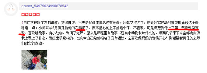 4月在學校聽了右腦講座,覺得挺好,當天參加講座報名還有送課。我就又報名了,想讓我家好動的寶貝能通過這個課穩(wěn)定一點。小帥哥從5月份開始他的右腦課了,原本擔心他上不好這個課,不喜歡,可是沒想到他上了第一節(jié)后就說喜歡,喜歡聽故事,有小動物,我問了老師,原來是課程里有故事書還有小動物卡片什么的,后面幾節(jié)課下來寶都會告訴我上課上了什么,我挺出乎意料的,也慶幸自己給他報名了沒有錯過,寶喜歡做媽媽的我很開心!謝謝嬰智貝佳的老師們對寶的幫助。