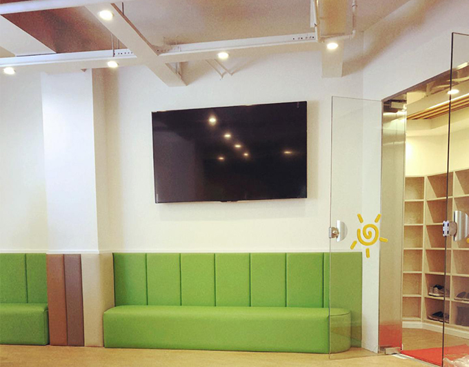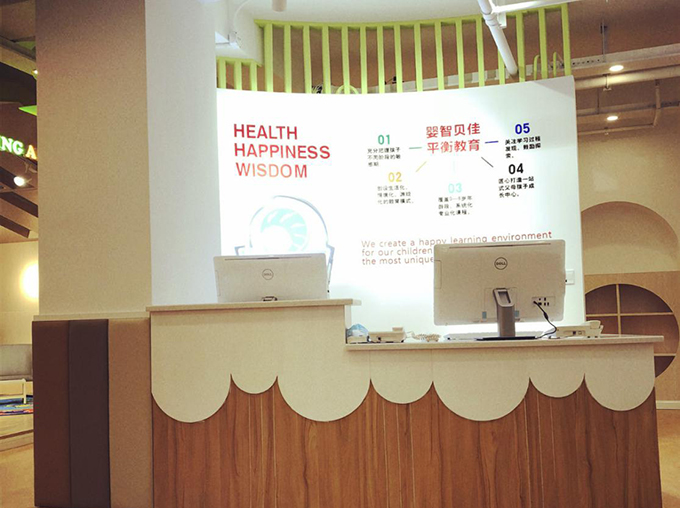 前臺(tái)背景墻上企業(yè)文化理念,時(shí)刻提醒著作為一名教育者的使命。我們要培養(yǎng)一群“HEALTH、HAPPINESS、WISDOM”的寶寶!